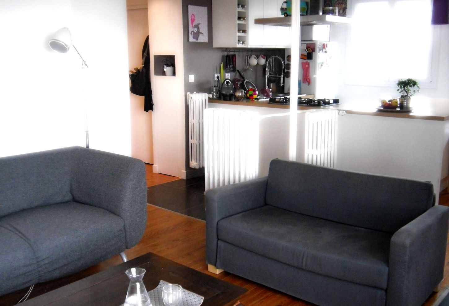Composé de multiples petites pièces totalement cloisonnées et organisées autour d’une entrée exagérément grande, l’appartement ne profite que très peu de sa triple exposition.